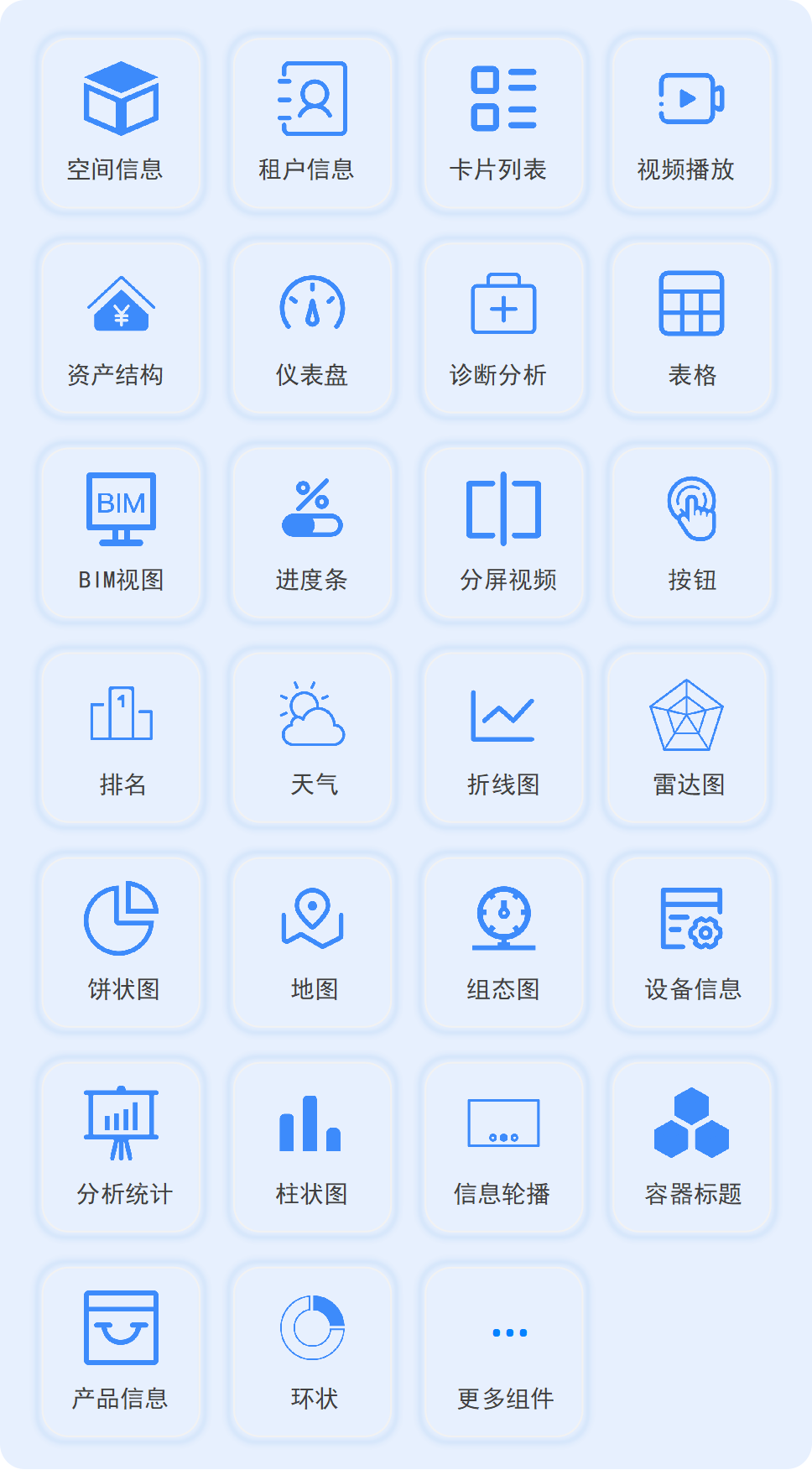 平台支持图表、三维模型、电子图等多种的可视化图表组件,充分满足用户多样化的可视化需求。