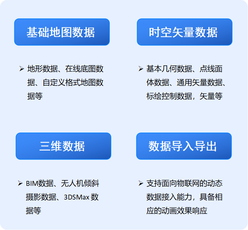 1. 平台具备对基础数据、地理信息、空间模型进行整合、分析、渲染、管理的能力。